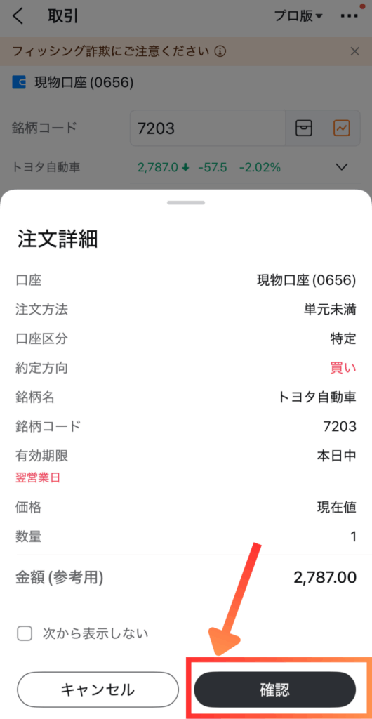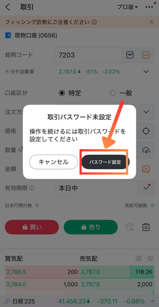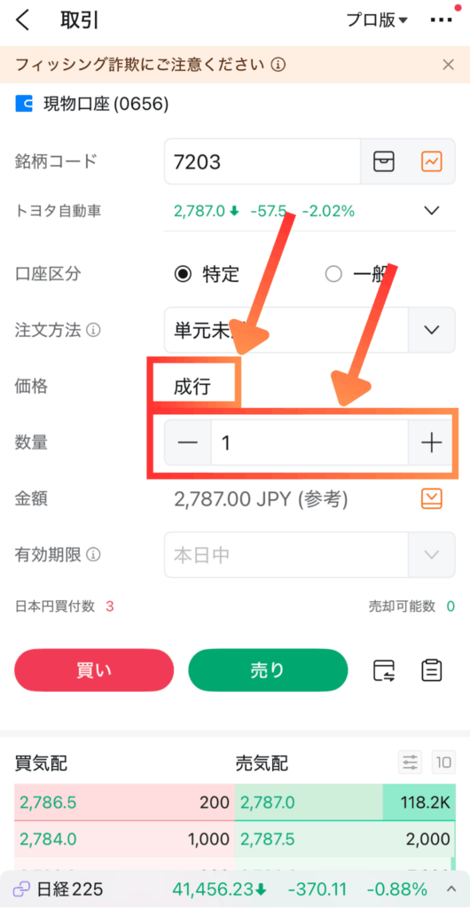 口座区分・注文方法・価格・数量を選択