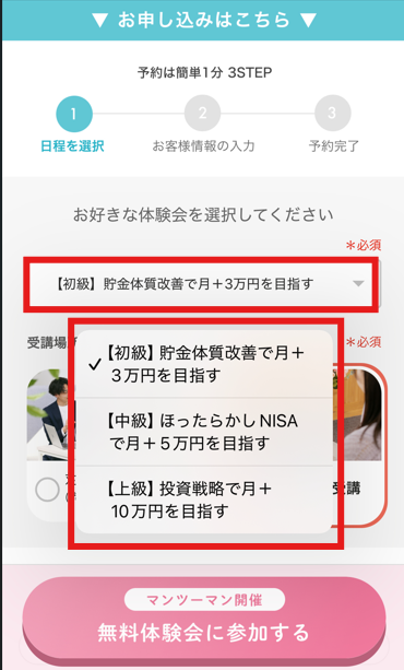目的や悩みに合わせてレベル別に3つの無料体験講座が用意されてるよ!